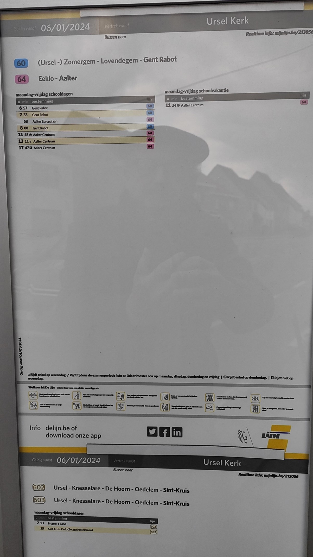 Tenslotte, een bus nemen naar Brugge is het eeuwige pijnpunt. Nog eens: Ursel ligt pal in het midden tussen Gent en Brugge, maar toch is het water richting Brugge veel te diep. Dit is des te merkwaardig als je weet dat Ursel in de middeleeuwen deel uit maakte van het Brugse Vrije, niet van de Gentse Oudburg. Vandaag kun je kiezen uit twee bussen, met 2 (u leest het goed) minuten verschil ! U kunt om 7u13 met Lijn 603 naar Brugge zelf of om 7u15 met Lijn 602 naar Brugges randgemeente Sint-Kruis. Even gaan winkelen, een pateetje eten of een museum bezoeken in Brugge? Vroeg opstaan en 1 à 2 uur wachten eer de winkels, tea rooms en musea open gaan.